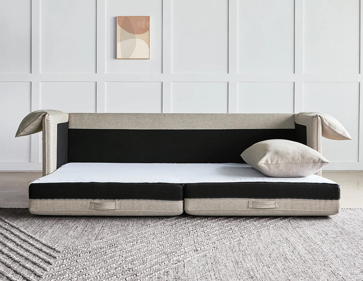 The Japanese word "Neru" means "to sleep or lie down”. Our Neru Sofabed was designed with this in mind - prioritising both comfort and style to create a sofa that has you covered. During the day, feather-filled back cushions and integrated bolsters create a cozy place for power naps or lounging. At night, a simple, origami-like fold-out function reveals a queen-size bed to welcome overnight guests. French-seam detailing on the slender arms adds elegance and style.