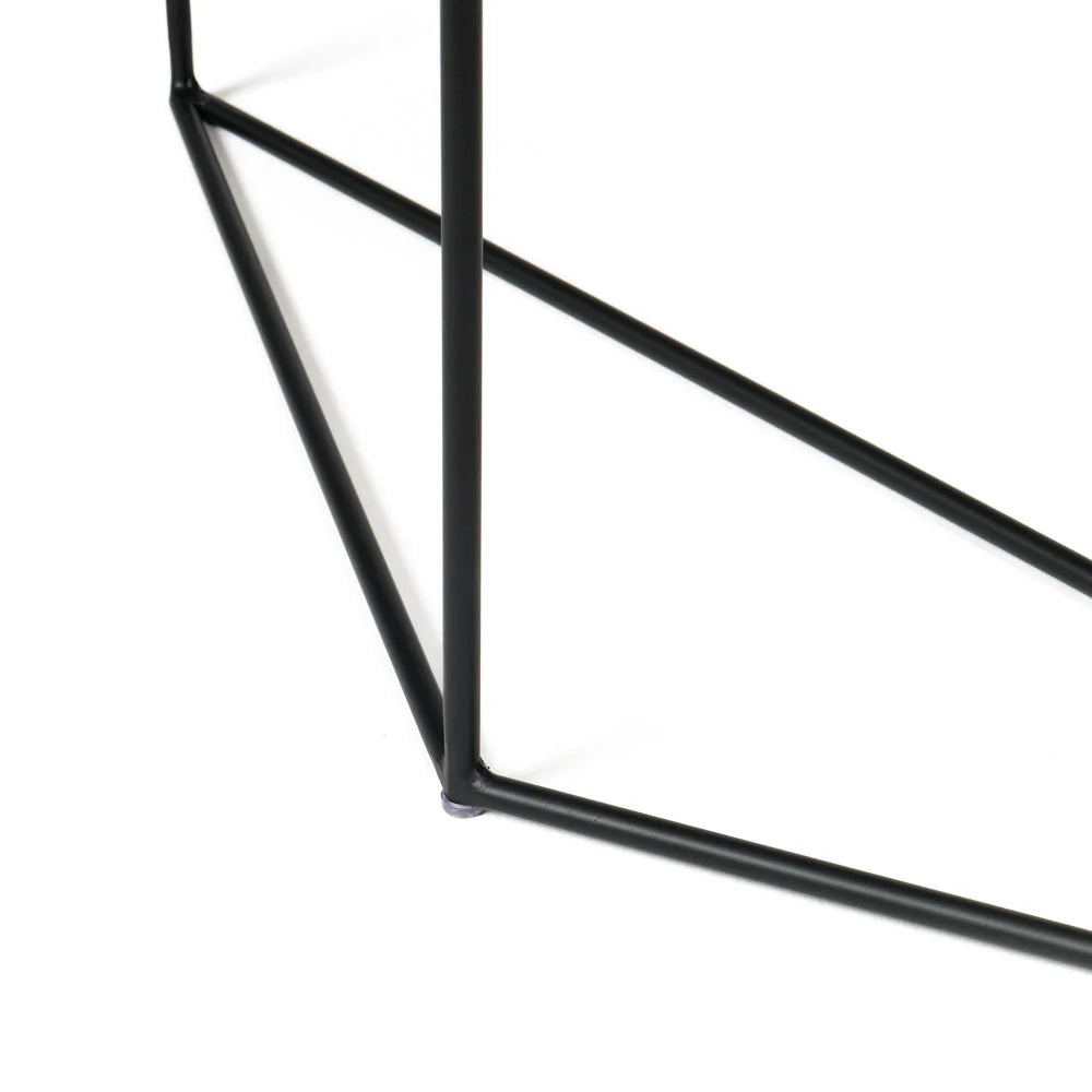 The Porter Console Table is a minimalist, geometric accent piece well suited for modern spaces. It features a veneered wood top and a raised, solid wood edge detail with rounded corners. The eye-catching base features an architectural powder-coated metal triangle. The table’s slender, compact form is perfect for entryways and other smaller spaces where every square foot counts.