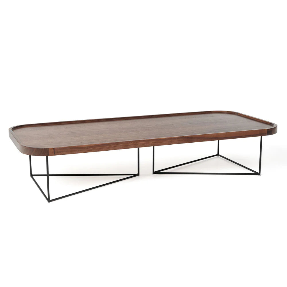 The Rectangular Porter Coffee Table offers an expansive, low-profile surface with refined, modern elements. It features a veneered wood top and a raised, solid wood edge detail with rounded corners. The eye-catching base features an architectural arrangement of two, powder-coated metal triangles. Part of the Porter Series, it is designed to nest with the Porter End Table.